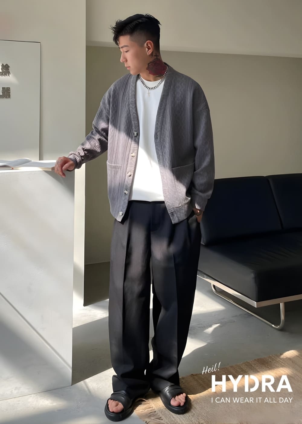 Bộ đôi áo cardigan và quần tối màu cũng là những item lý tưởng để phối đồ basic nam. Outfit này là lựa chọn tuyệt vời cho những bạn trai hướng nội, yêu thích sự đơn giản nhưng không đơn điệu. Tinh tế chọn những mẫu quần màu tối như đen, xám, nâu mix với áo tone màu sáng như trắng, nâu nhạt hay be, xám,... sẽ rất hợp.