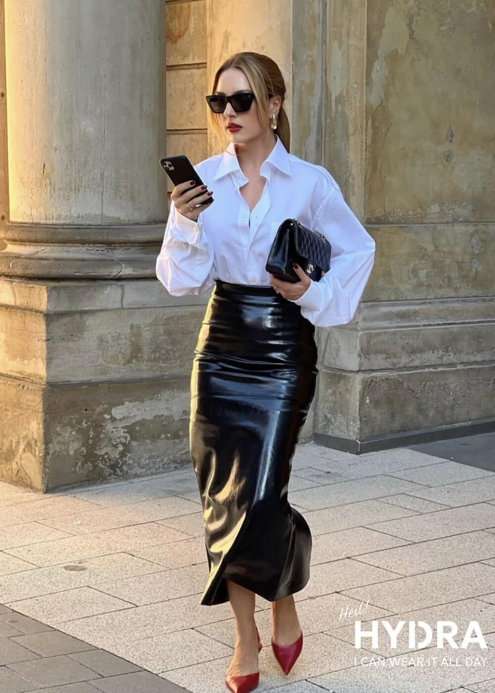 Nếu bạn muốn phối đồ nữ cá tính nhưng vẫn giữ được vẻ ngoài sang trọng, hãy thử kết hợp phá cách cùng chân váy da bóng. Một chiếc sơ mi đi cùng chân váy đen chất liệu da bóng sẽ mang đến diện mạo cho các nàng vô cùng sành điệu. Khi điểm thêm phụ kiện như khuyên tai hoặc nhẫn, tổng thể outfit sẽ càng thêm ấn tượng hơn nhé.