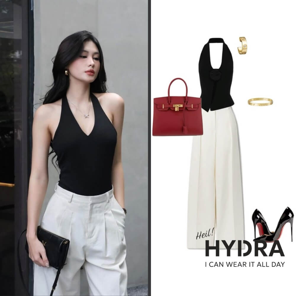 Cách phối đồ nữ đi chơi Tết với áo cổ yếm và quần ống rộng
