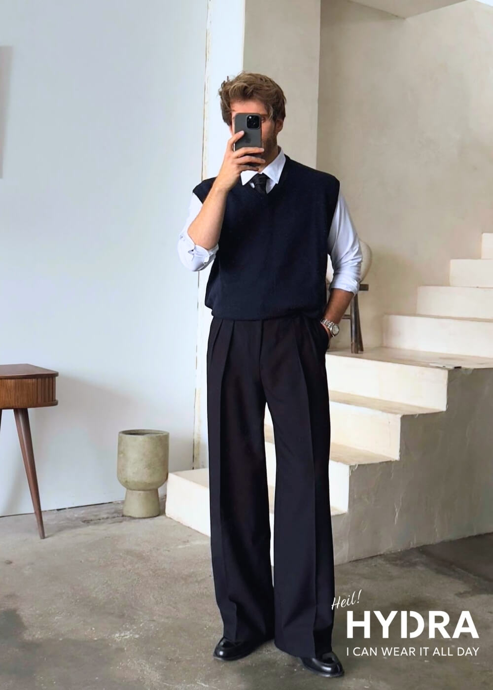 Về chất liệu, hãy chọn sơ mi có chất liệu cotton thoáng mát để thoải mái hoạt động và áo gile chất liệu dày dặn để giữ form dáng chuẩn. Cuối cùng, đừng quên những món phụ kiện kinh điển như đồng hồ, kính hoặc thắt lưng da để hài hòa tổng thể trang phục.