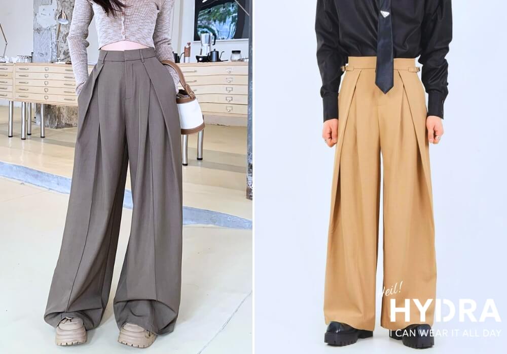 Tạo hiệu ứng kéo dài đôi chân: Form quần ống rộng kết hợp cạp quần cao giúp định hình tỷ lệ phần thân dưới, đặc biệt hiệu quả khi đi cùng giày mũi nhọn hoặc giày cao gót.