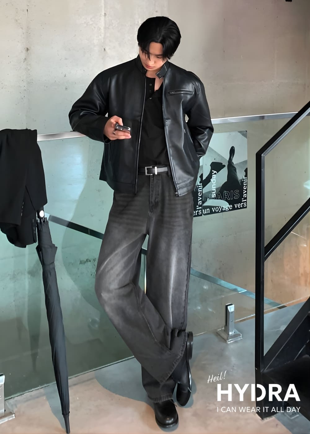 Ngoài những gợi ý kể trên, outfit all black cũng là cách phối đồ màu đen cho nam đơn giản nhưng vẫn đủ sức tạo ấn tượng nếu bạn xử lý tốt chi tiết. Để tránh cảm giác đơn điệu, bạn nên tập trung vào sự khác biệt về chất liệu và form dáng, ví dụ như kết hợp áo da với quần jean nam hoặc áo thun phối với quần ống rộng. Chính những điểm nhỏ này sẽ giúp bộ outfit có chiều sâu hơn mà không cần thêm màu sắc.