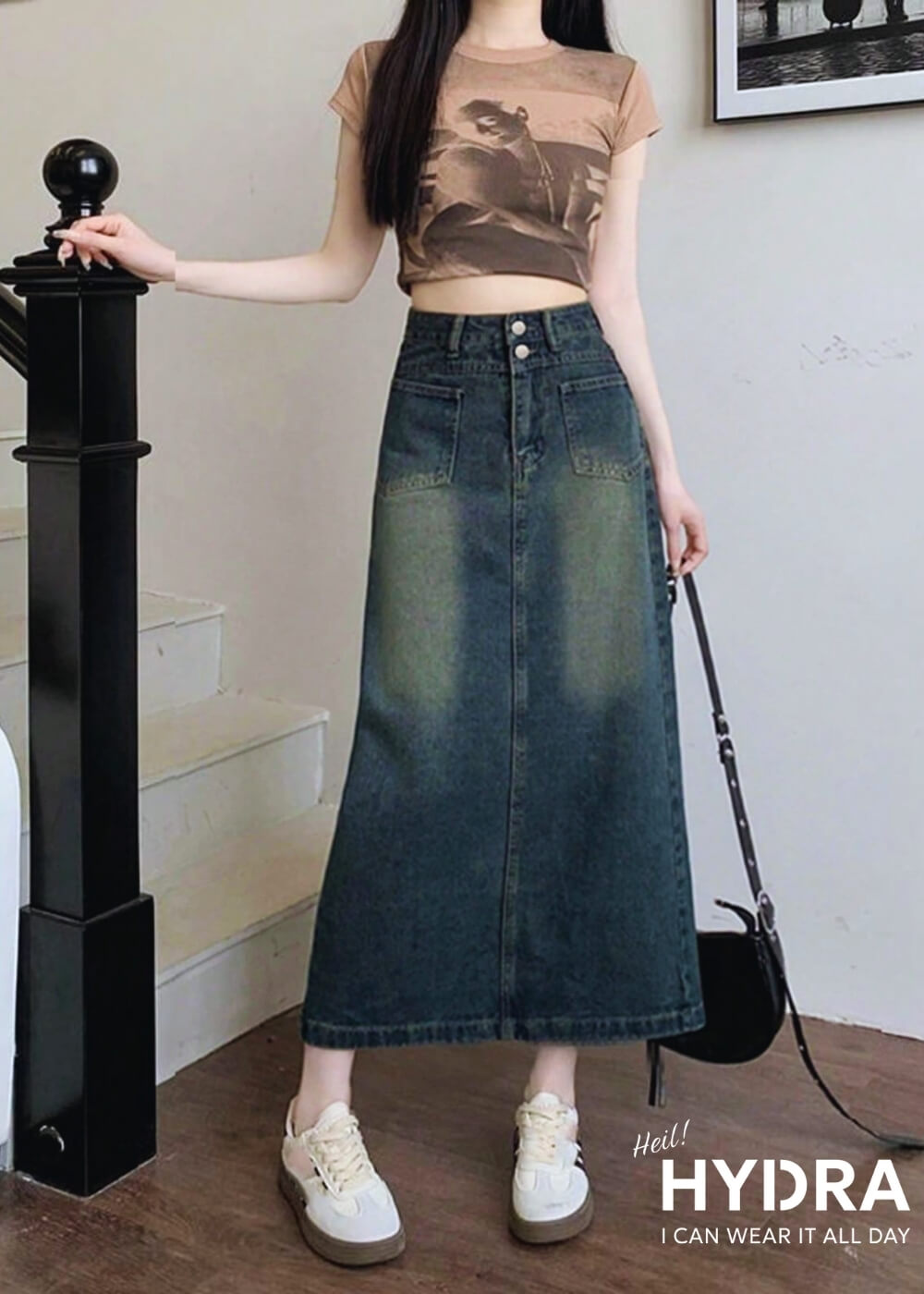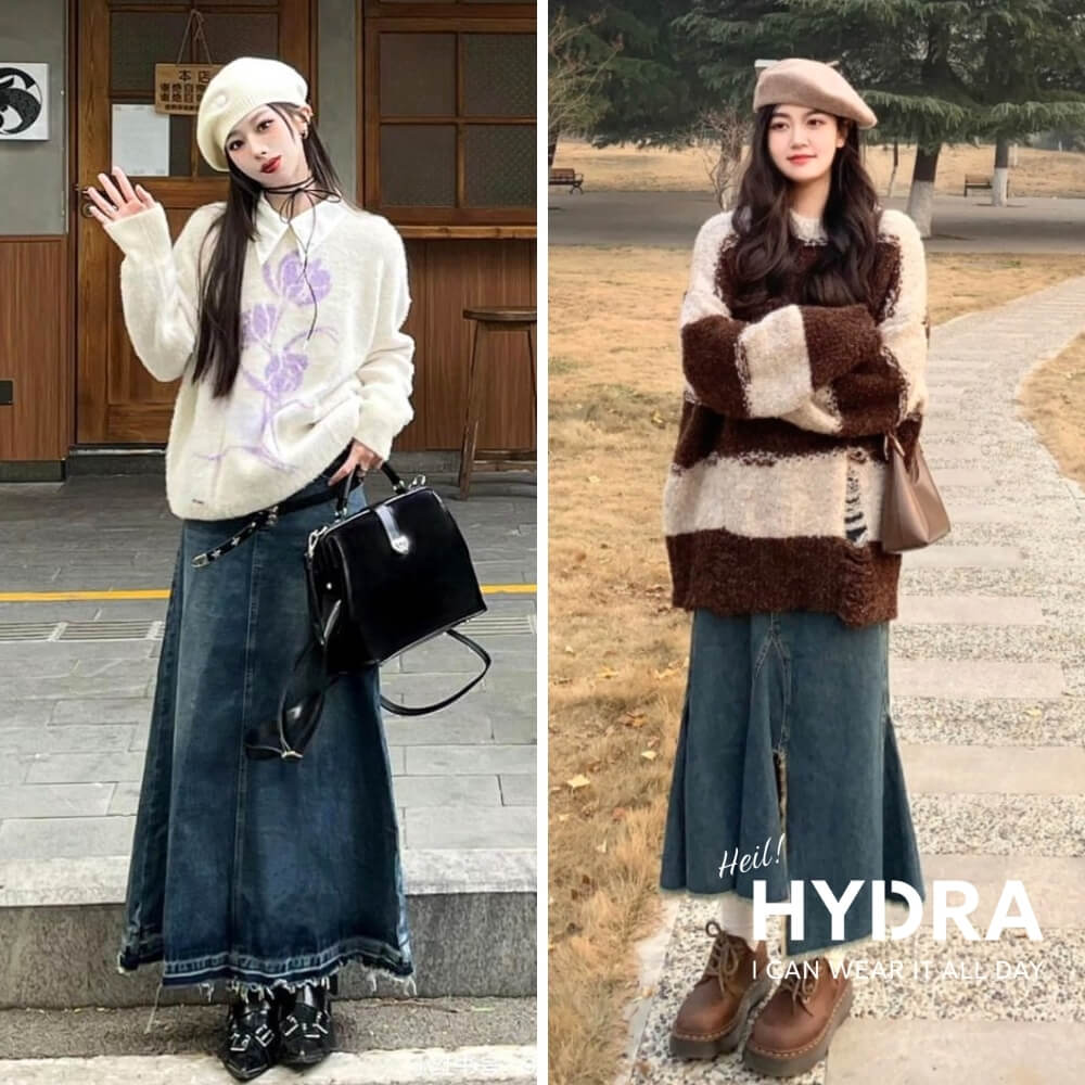 Công thức phối đồ với chân váy jean chữ A dài cùng áo sweater hoặc hoodie mang đến một diện mạo chuẩn phong cách Hàn Quốc, vừa dịu dàng lại vừa cực kỳ cá tính. Sự kết hợp giữa sweater form rộng và chân váy dài chữ A tạo nên một tổng thể trẻ trung và trendy. Tùy thuộc vào độ dài của chân váy, bạn có thể sơ vin nhẹ phần vạt áo phía trước hoặc để áo buông tự nhiên để giữ sự thoải mái và năng động.