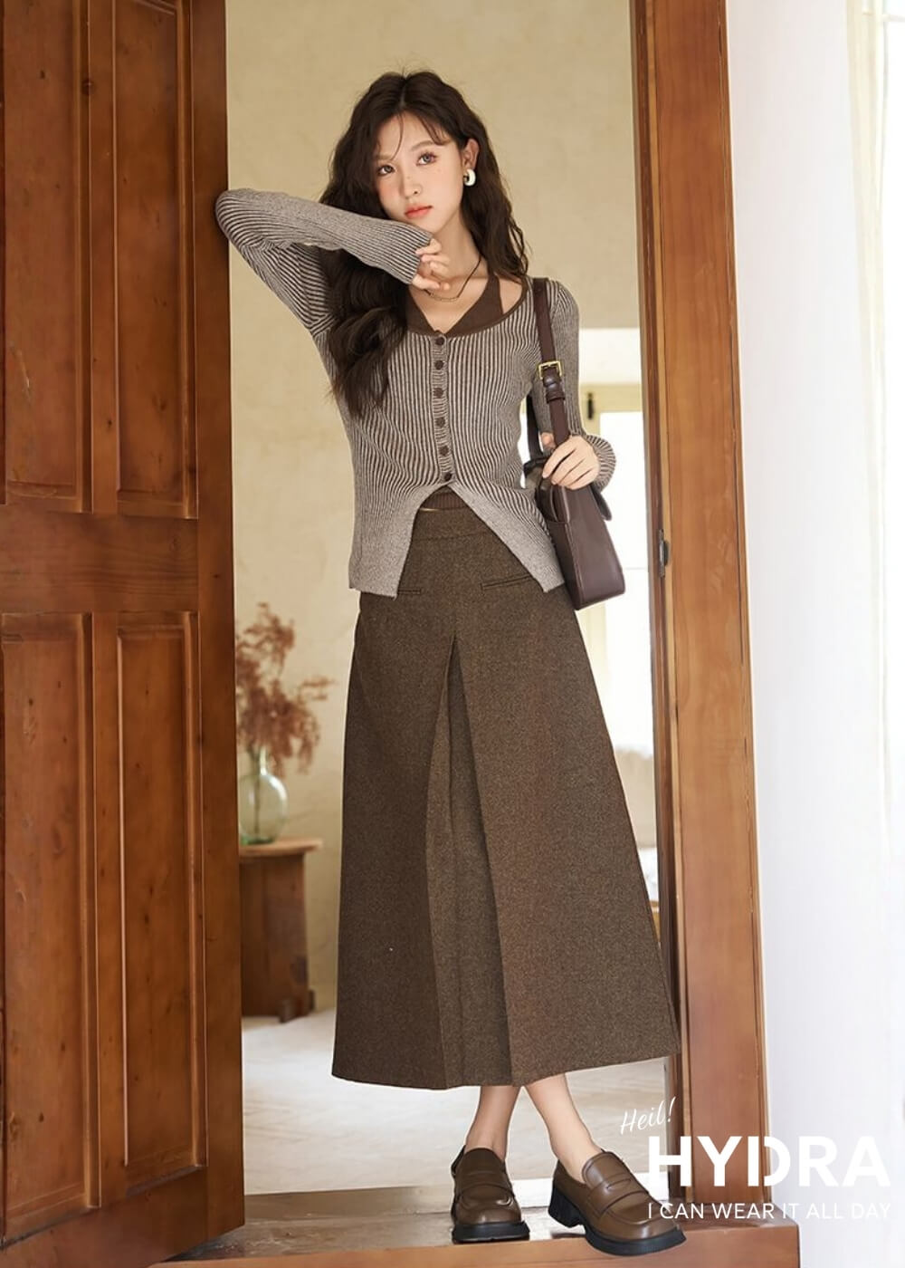 Khi tiết trời chuyển sang se lạnh, áo len hoặc cardigan là lựa chọn hoàn hảo để phối đồ với chân váy chữ A dáng dài. Sự kết hợp này mang lại vẻ ngoài ấm áp, dịu dàng chuẩn "nàng thơ" cho mùa thu đông.