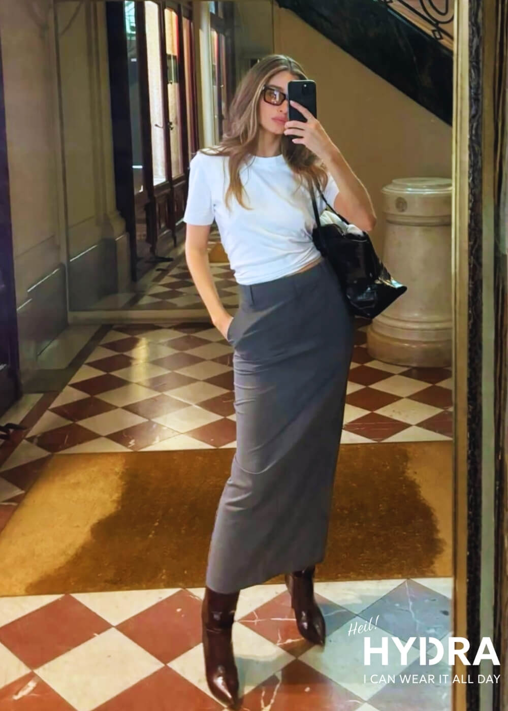 Nếu bạn muốn chiếc váy dài trở nên năng động hơn, hãy thử ngay công thức phối đồ với chân váy chữ A dáng dài cùng áo thun đơn giản. Sự kết hợp giữa áo phông trơn hoặc in chữ nhỏ với chân váy chữ A dài chất liệu denim hoặc kaki sẽ mang đến diện mạo tươi mới, năng động nhưng vẫn giữ được nét nữ tính.