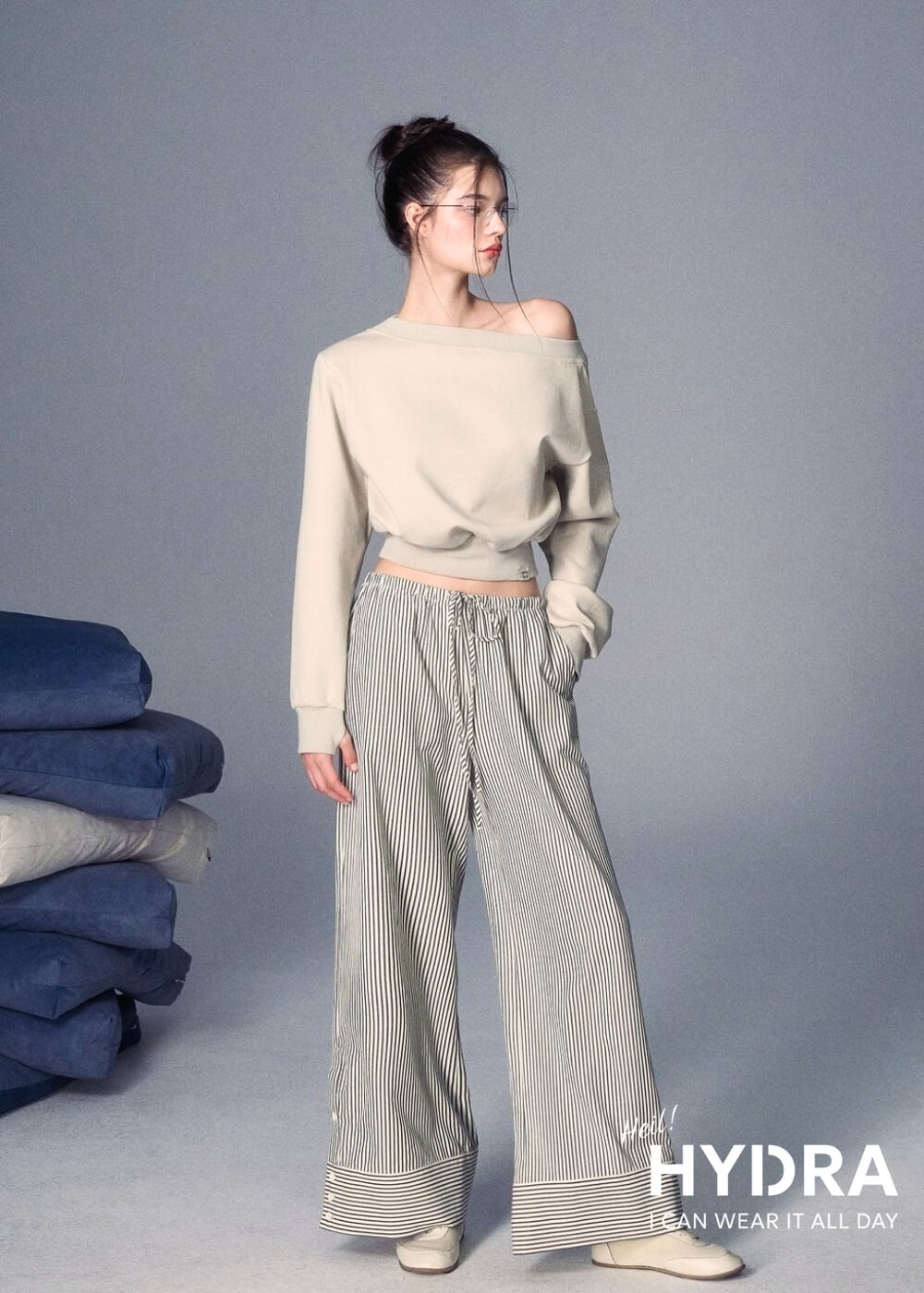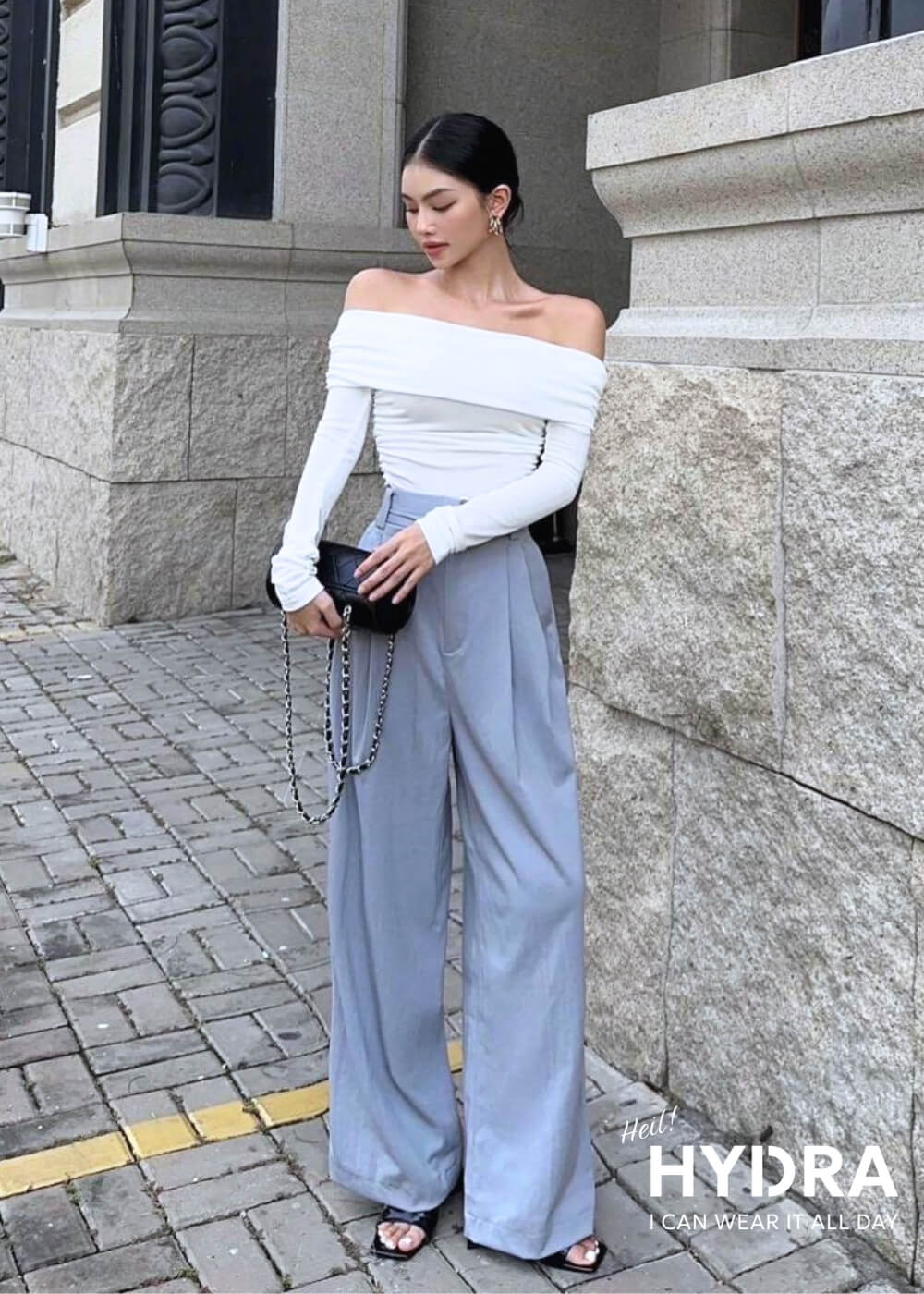Nếu kết hợp quần suông ống rộng và áo trễ vai sẽ tạo nên tổng thể hài hòa và tạo cảm giác vóc dáng cân đối hơn. Phong cách này cũng rất linh hoạt, dễ dàng ứng dụng trong nhiều dịp từ dạo phố, cafe gặp mặt bạn bè, hẹn hò,...