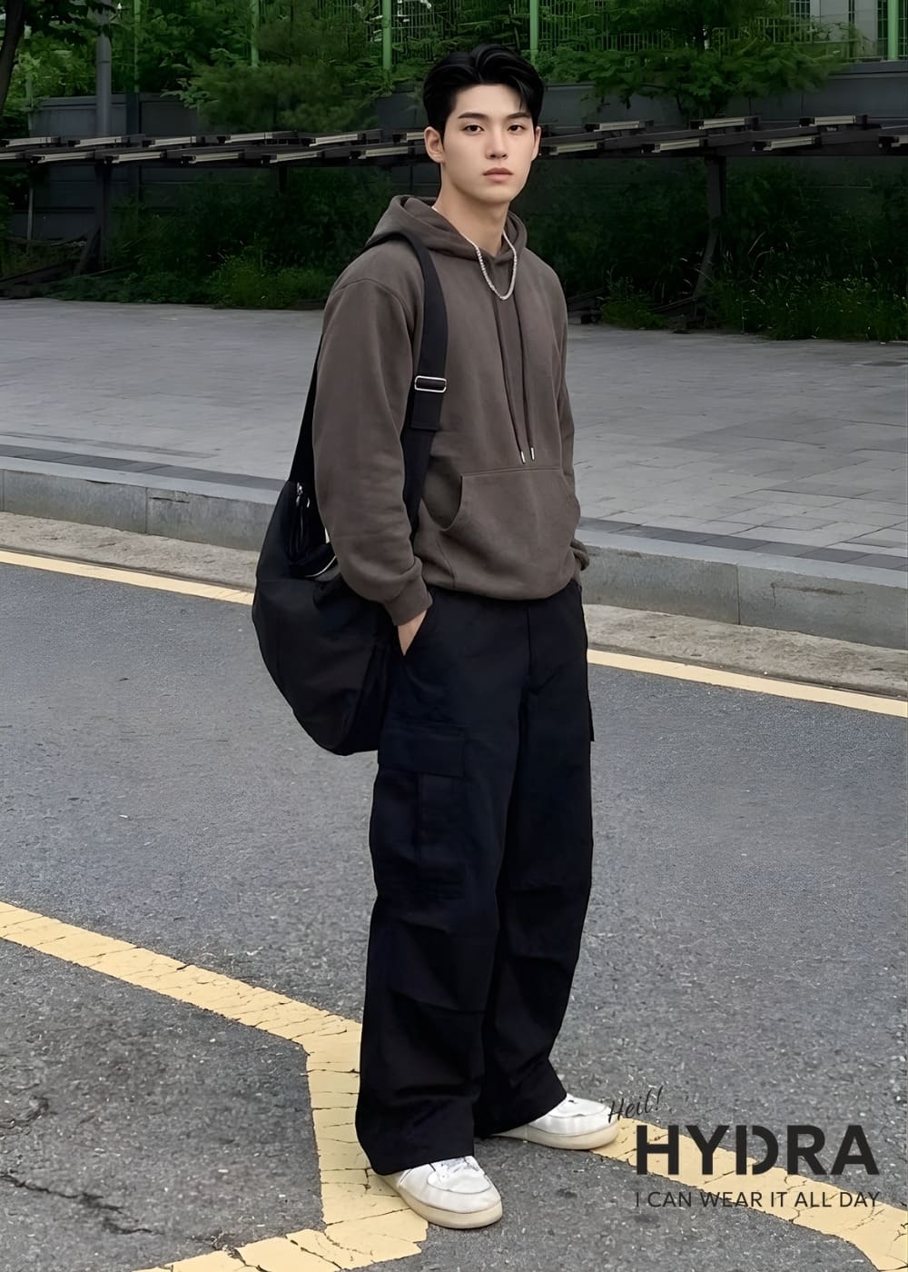 Nếu anh em ưu tiên sự thoải mái nhưng vẫn muốn giữ vẻ ngoài gọn gàng, quần kaki đen kết hợp cùng áo khoác hoodie sẽ là lựa chọn rất hợp lý. Outfit này tạo cảm giác năng động, trẻ trung và có chút ấm áp, phù hợp cho những ngày thời tiết se lạnh hoặc đi chơi cuối tuần. Tùy vào sở thích cá nhân mà anh em có thể chọn hoodie màu trung tính như xám, be hoặc trắng để tổng thể outfit hài hòa hơn, không bị rối mắt.