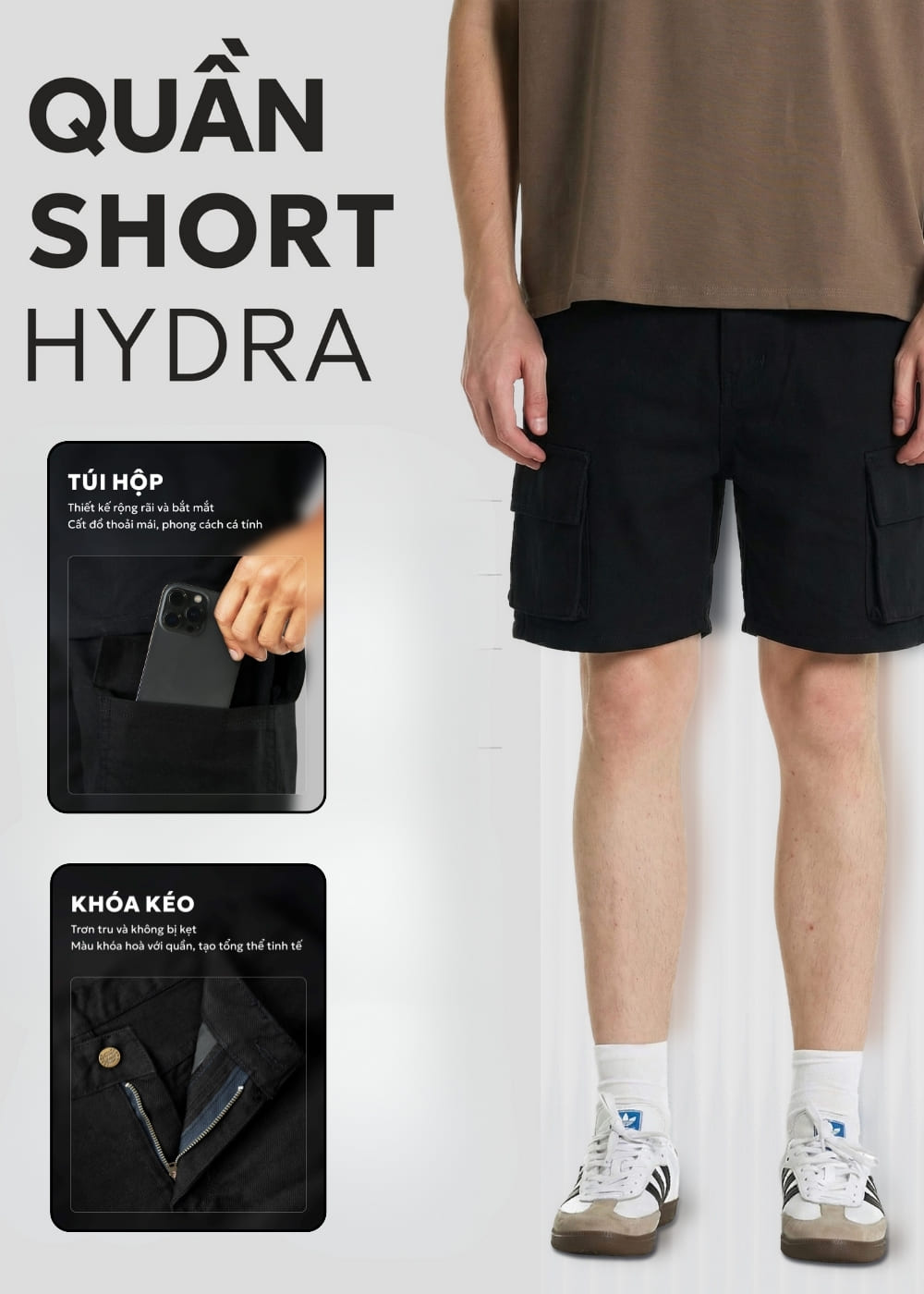 - Thiết kế tinh tế, hiện đại: Với form rộng phóng khoáng kết hợp cùng chi tiết túi hộp rộng rãi, bắt mắt, chúng mình mang đến những chiếc quần short năng động, thời trang. Từng chi tiết nhỏ như khóa kéo cũng được HYDRA chú trọng để đảm bảo sự trơn tru, tránh xảy ra tình trạng kẹt khóa khó chịu.